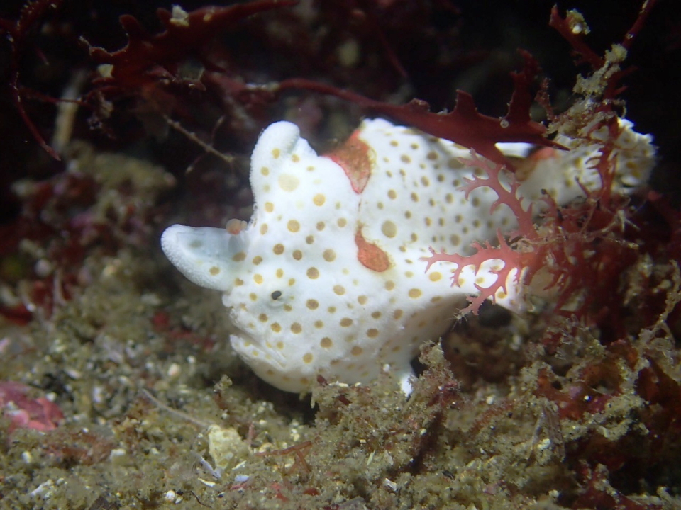 ドット柄の白いイロカエルアンコウ幼魚はノコノコと歩いてました。そろそろ引っ越しかな?