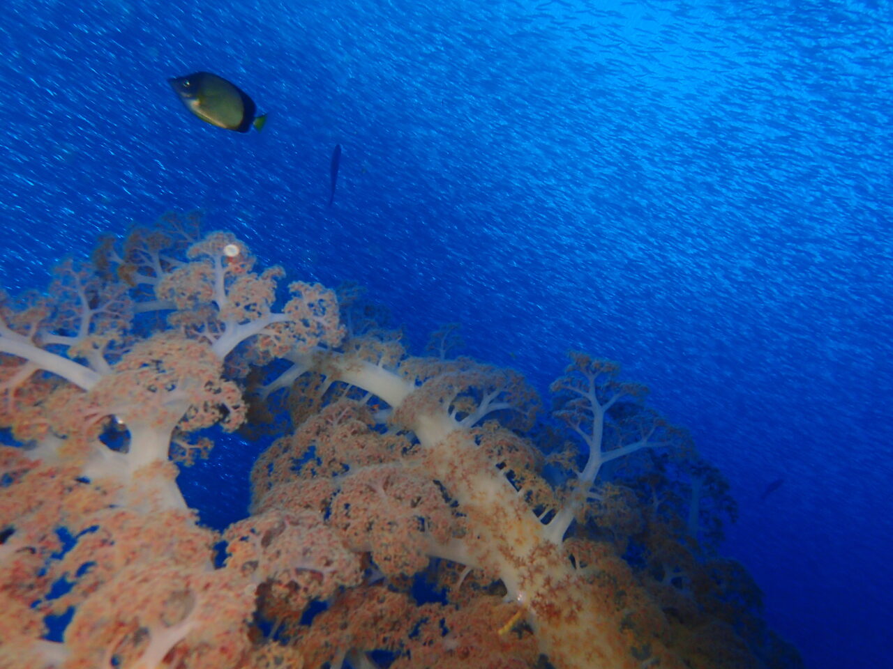 って事で、水深24m付近にある巨大なトサカから見上げたイワシの群れ!はこんな感じ。