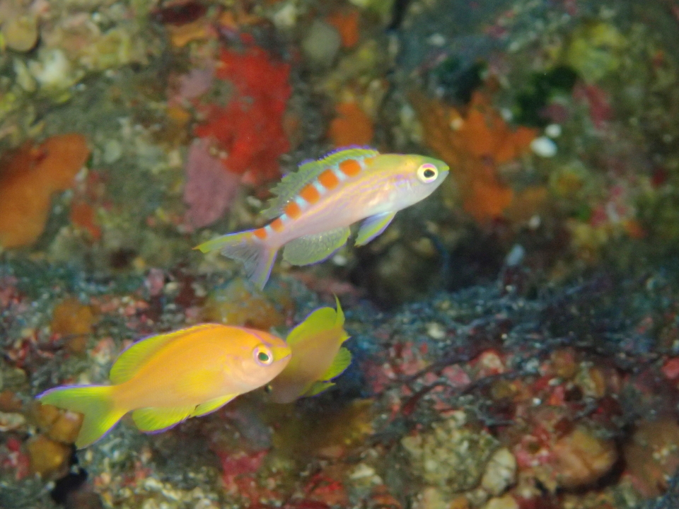 そのまま深場のアサヒの根まで行くと、今日は素敵なコラボに遭遇出来ました!ちょっとピントが甘くあまり素敵な写真ではありませんが、アサヒハナゴイ幼魚&コウリンハナダイ幼魚×2匹のコラボ!が運良く見れました。ちょっとどちらも鰭が痛んでいるのですが、ハナダイ好きな方なら嬉しいセットかと思います。