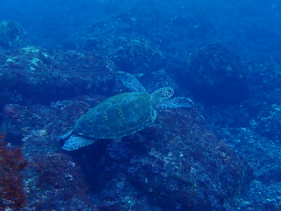 穏やかな水中を沖へ進むと、アオウミガメ祭り!!全部で大小5匹も見れました♪
