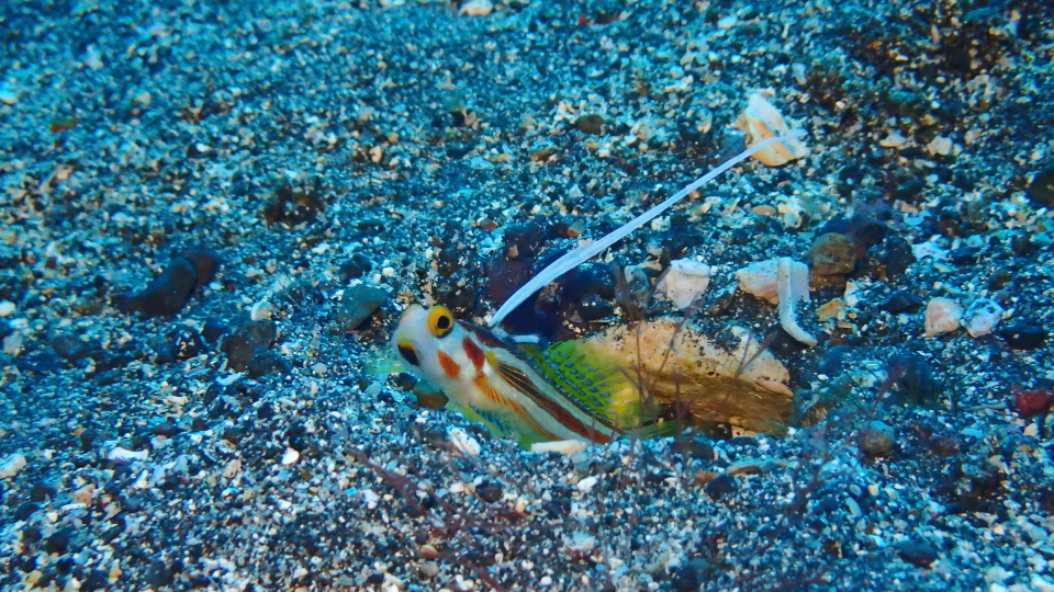 水温16℃台だし・・・ダメ元で立ち寄ると、今日は1匹だけでしたがヤシャハゼが巣穴から!!こんなに水温低いのに、でも食べなきゃ生きていけないから必死なんでしょうね。