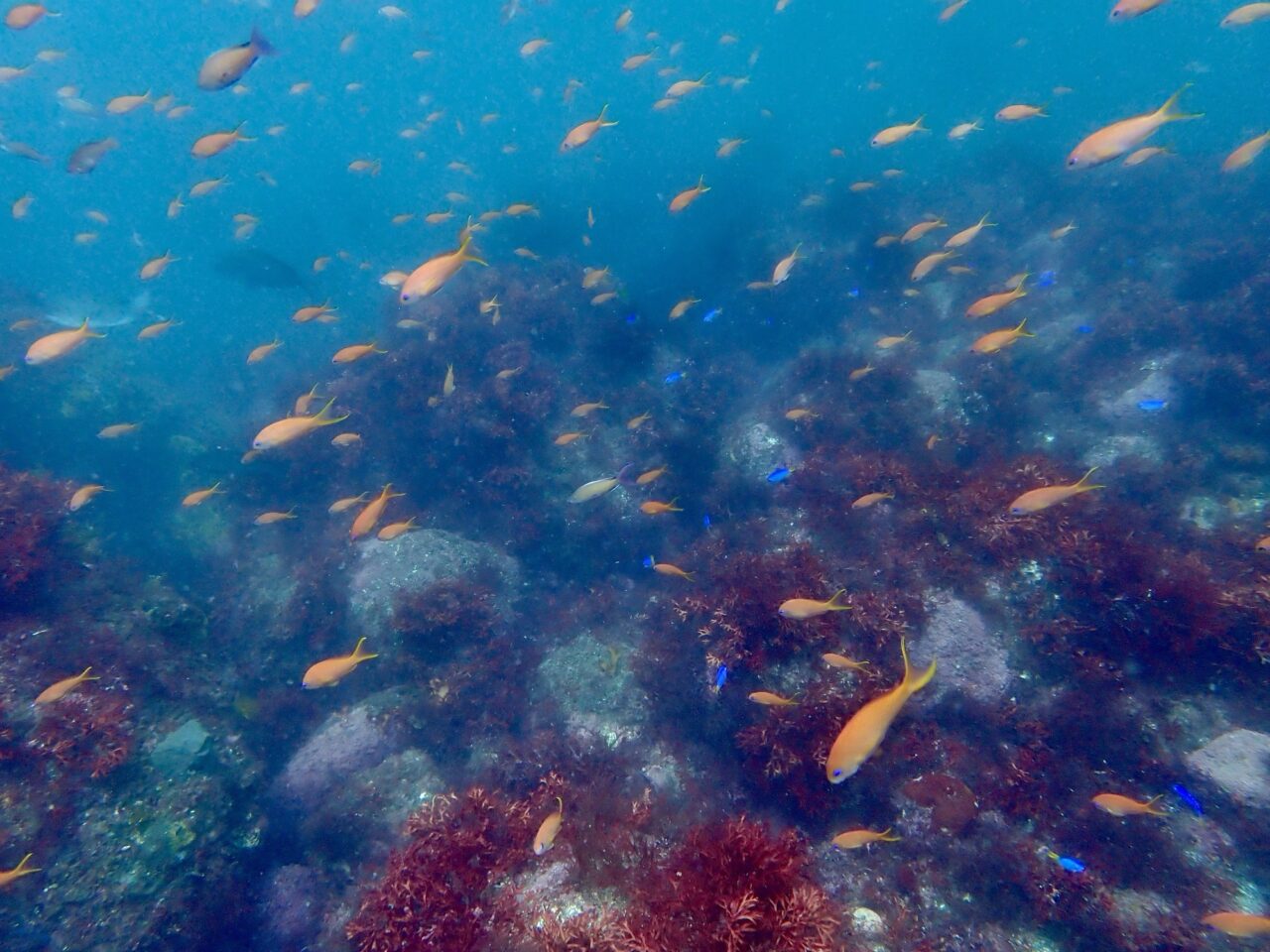 なんと、3名のビギナー様全員新しいカメラを降ろしたばっかりだったので、透明度より魚影の濃さを求めて秋の浜へ!