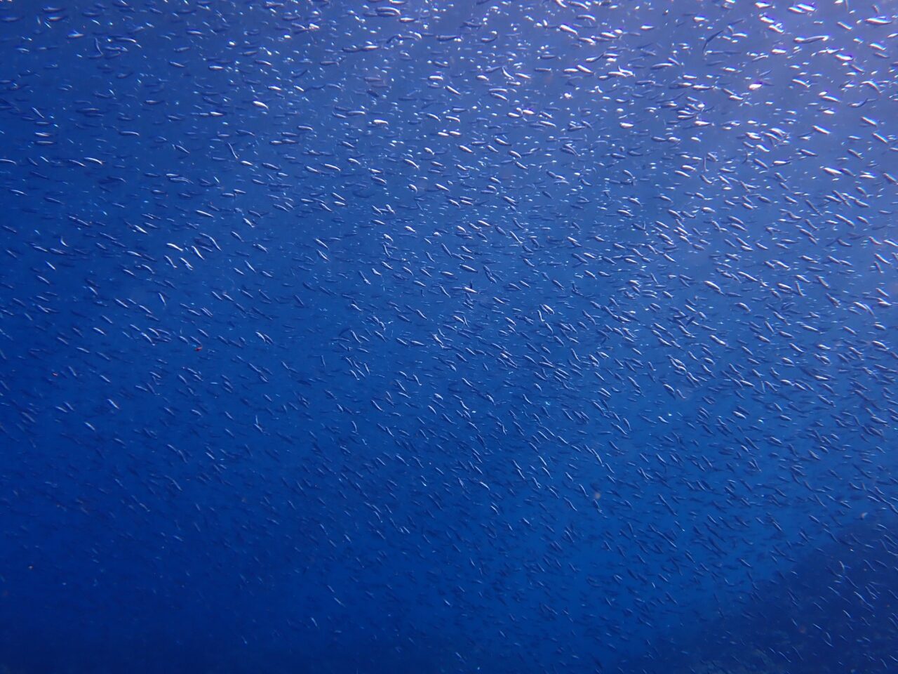 そして、浅場へ帰ってくると水面がキラキラと光り輝いていたのでよく見るとタカベの幼魚が数千匹群れていました!