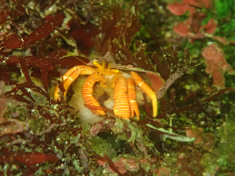 浅場に戻り出し、海藻の下でフチナガワモンヤドカリに遭遇。意外と派手なので目立ちます。