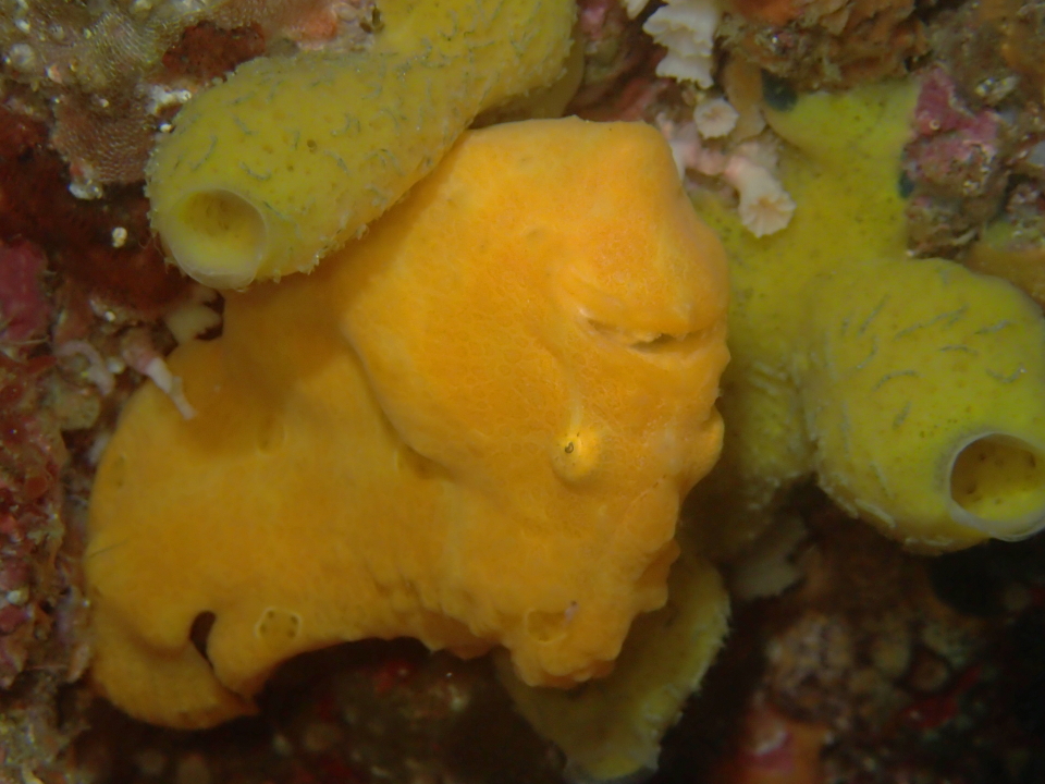 もう2ヵ月以上同じ場所にいる黄色いオオモンカエルアンコウ約10cm