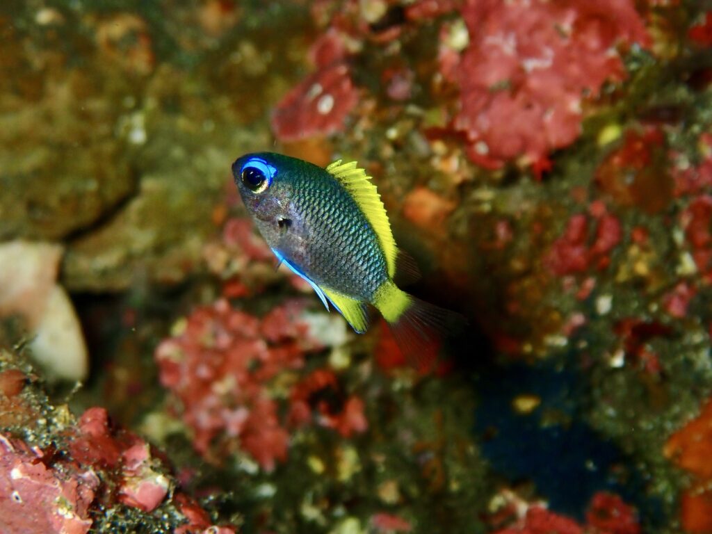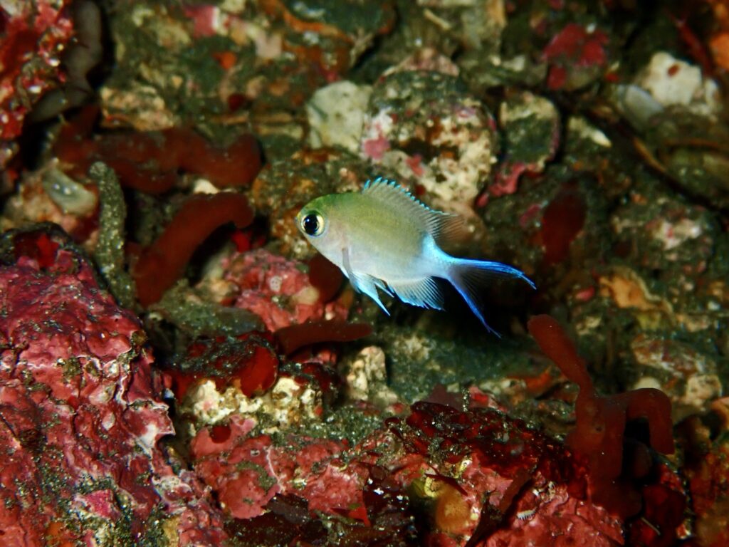 キレイな色合いのマルスズメダイ幼魚なんかも