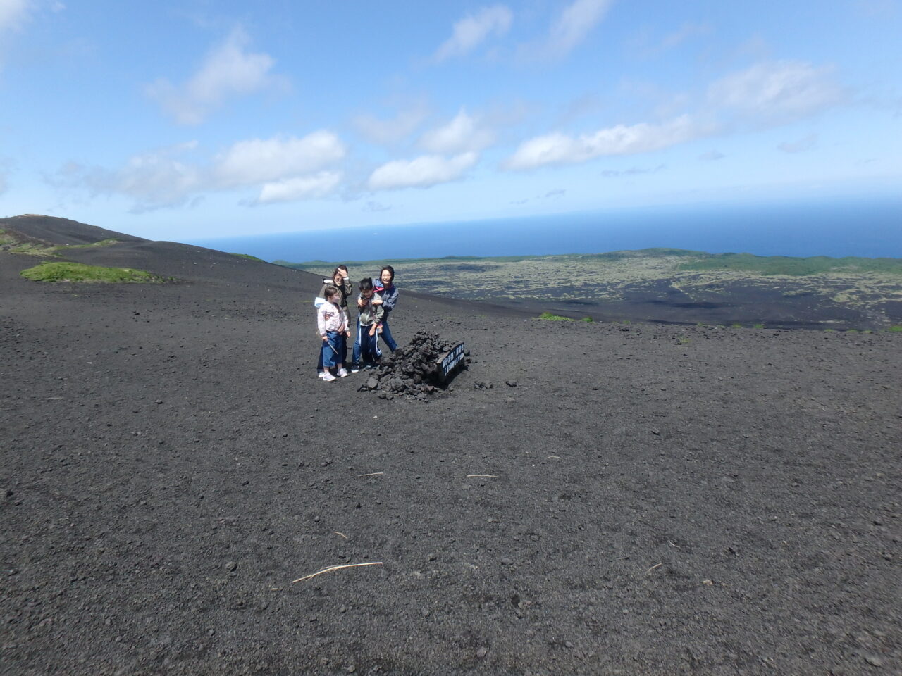 ラストはやっぱり外せない、三原山の溶岩流&噴火口!不思議な溶岩を沢山見て、ダイナミックな火口も見て、子供達は見事に貴重な左マイマイ(左巻きのカタツムリ)を沢山見つけて、長い1日が終わりました♪子供達も沢山はしゃいで歩いたので、帰りの車中はグッスリでした。