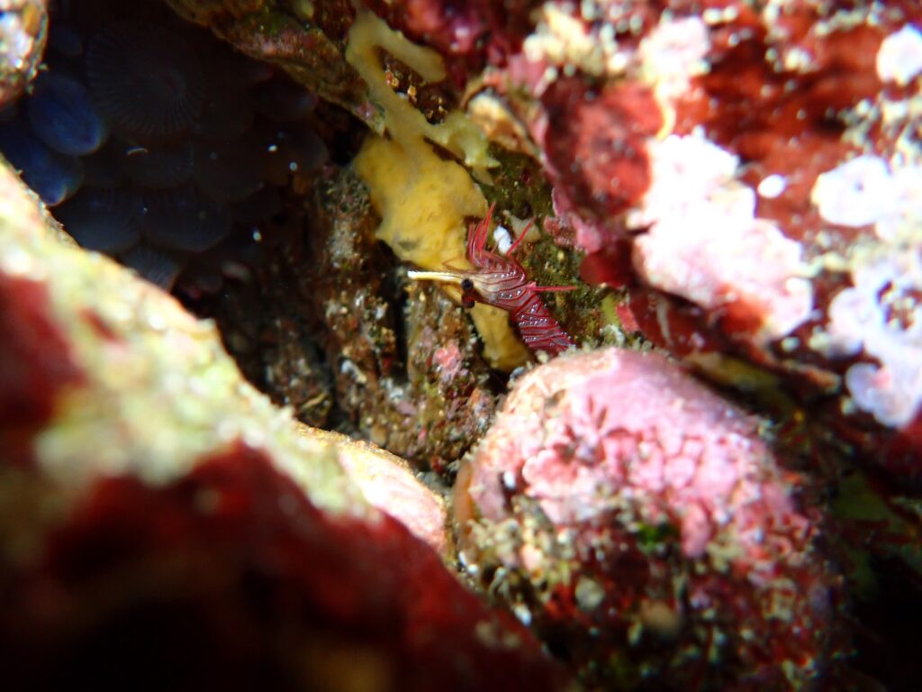 イソギンチャク近くのくぼみにサラサエビ🦐