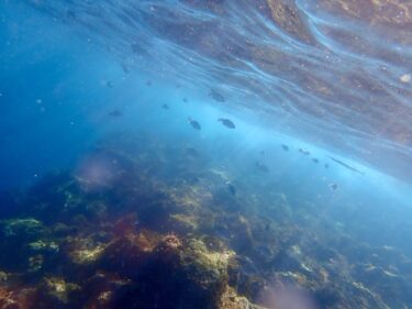 水深6mにいるクマノミに向かってスキンダイビングしたり、水深3mにある小さなアーチを潜りくぐって遊んだりもしてくれて元気いっぱいなツアーでした!水温的にはまだちょっと低いので、色鮮やかな魚は少なめでしたが・・・美味しそうな魚の群れ!には沢山会えたし、浅場では何種類かのフグ達にも会えて、あっという間の1時間でした。
