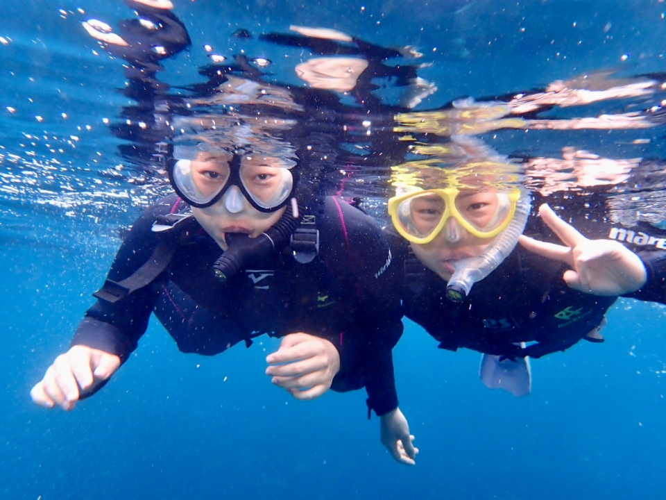 いよいよGWが始まりました!が、いきなり小雨スタートです(><)弱い北東風で昨日とは一転、肌寒さも感じる1日でしたが、元気な若者女子2人組!は寒さに負けずシュノーケリングを楽しんでくれました~(^^;