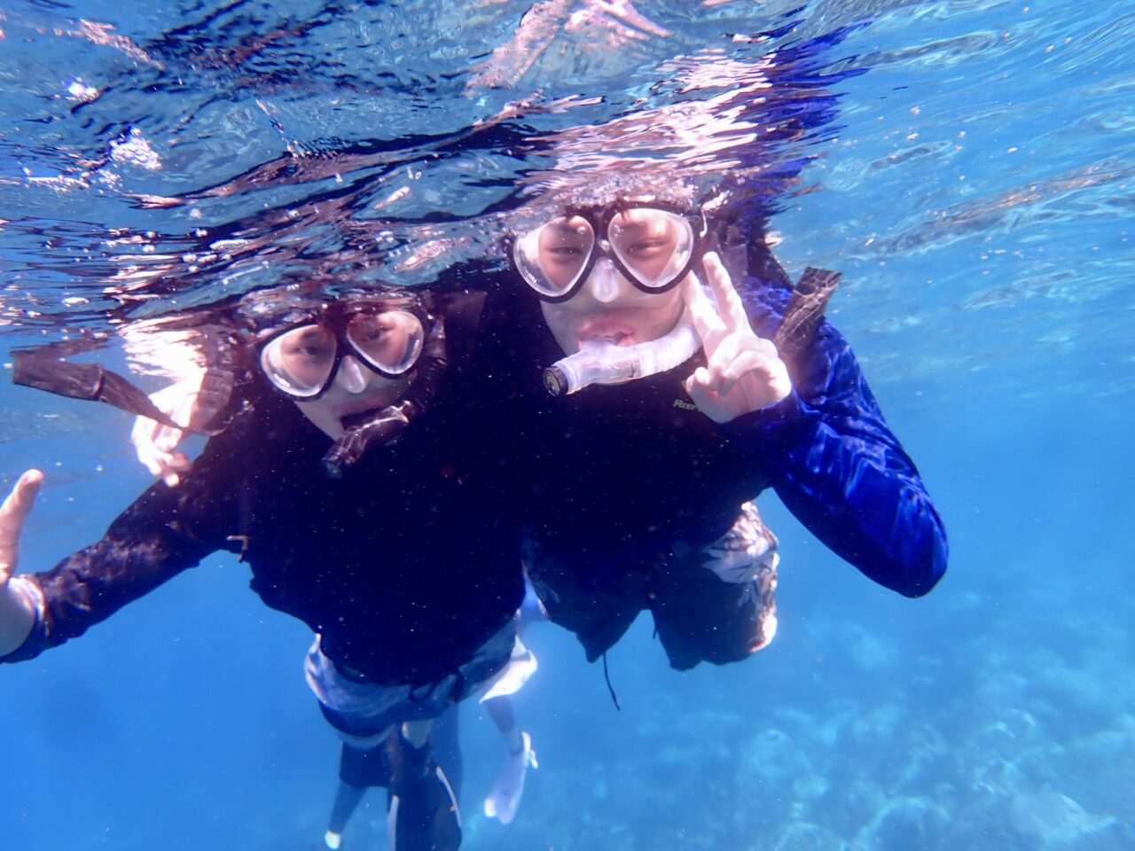 まずは足の着くところで、シュノーケルを使った呼吸の練習やフィンを使った泳ぎかたの練習!