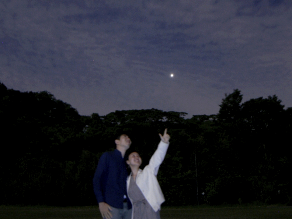 なので、最初に記念写真を撮った時はこんな感じで雲が多めでしたが・・・お客様の願いが通じたのか?ガイド中には徐々に雲が晴れてきて・・・ちょうど真上の辺り一面だけはキレイな星空が広がりました~まあ、後半の残り10分くらいにはまた雲で隠れてしまったのですが。。。