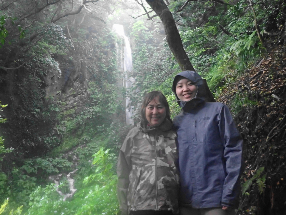 更に南に進み。。。本日ゲストが一番喜んだ場所へ!そうここは雨天限定のシカマガの滝です♪川の無い大島で滝が見れるのは、大雨が降っている日やその翌日くらいしか見れない、まさに幻の滝なんですよ~ まさに雨だからこそのサプライズスポットです。