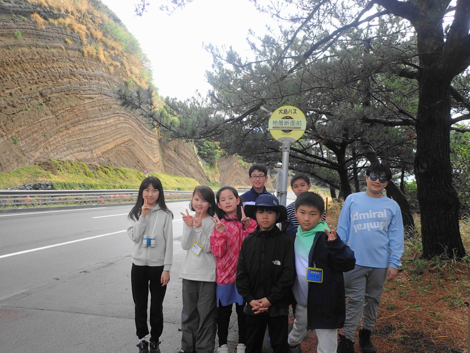 まずは山の霧が晴れる事を願って、予定を変更して地層大切断面から廻ってみました!子供達からは「教科書の写真で見た事ある地層だあ!」と声も聞こえましたが、世界中から注目されている大島自慢の地層なんです。子供達も初めて見る本物の巨大地層のスケールに感動していました♪